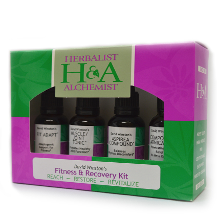The Fitness & Recovery Kit includes four formulas: Fit Adapt™ - David's favorite adaptogens for athletes of all levels, Muscle/Joint Tonic™ - supportive to the muscles, joints and connective tissue, Aspirea Compound™ - helpful to balance physical discomfort many experience the day after a new muscle group workout and completing the kit is soothing topical Compound Arnica Oil™ no athlete should be without.